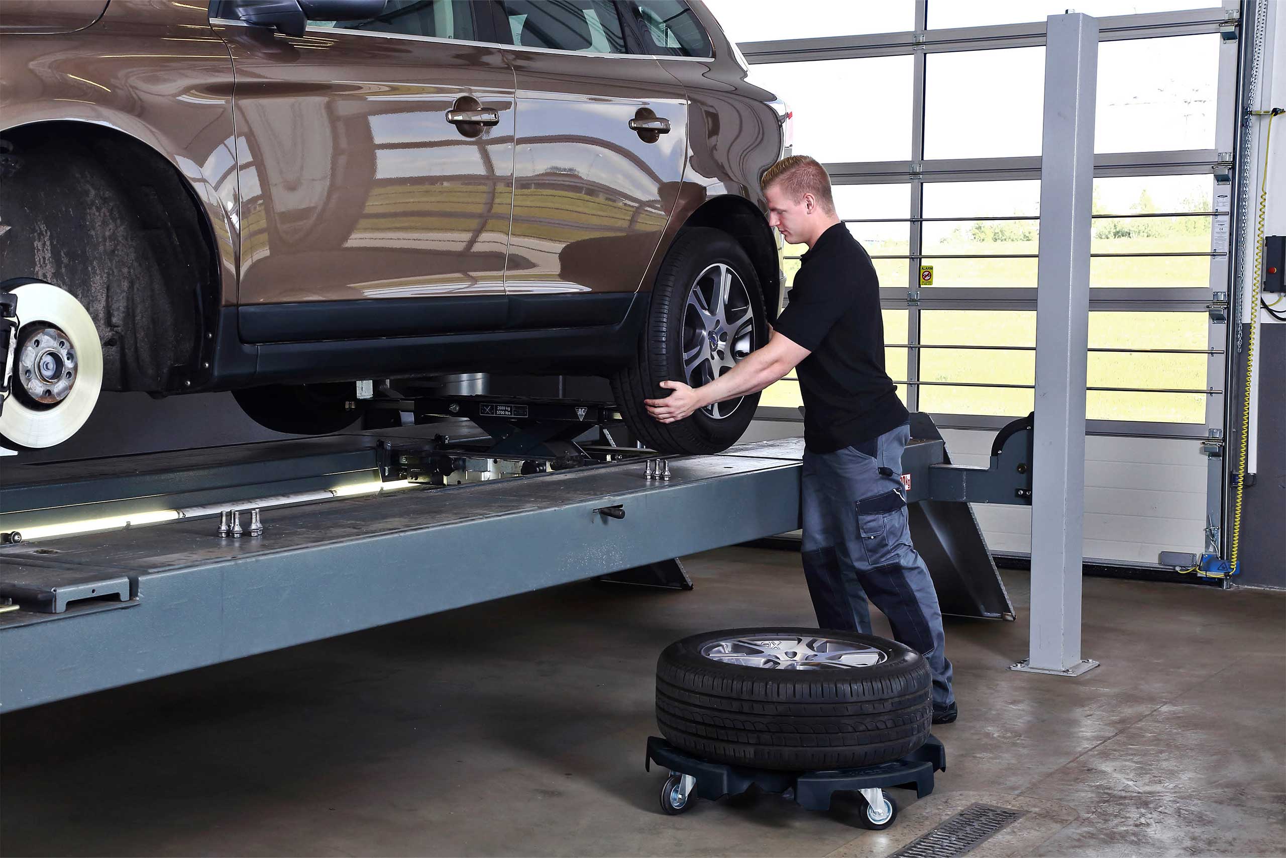 Efter afmontering af hjulene kan disse nemt og ubesværet køres hen til eksempelvis dækfritrykkeren for at udføre eventuelt dækarbejde.