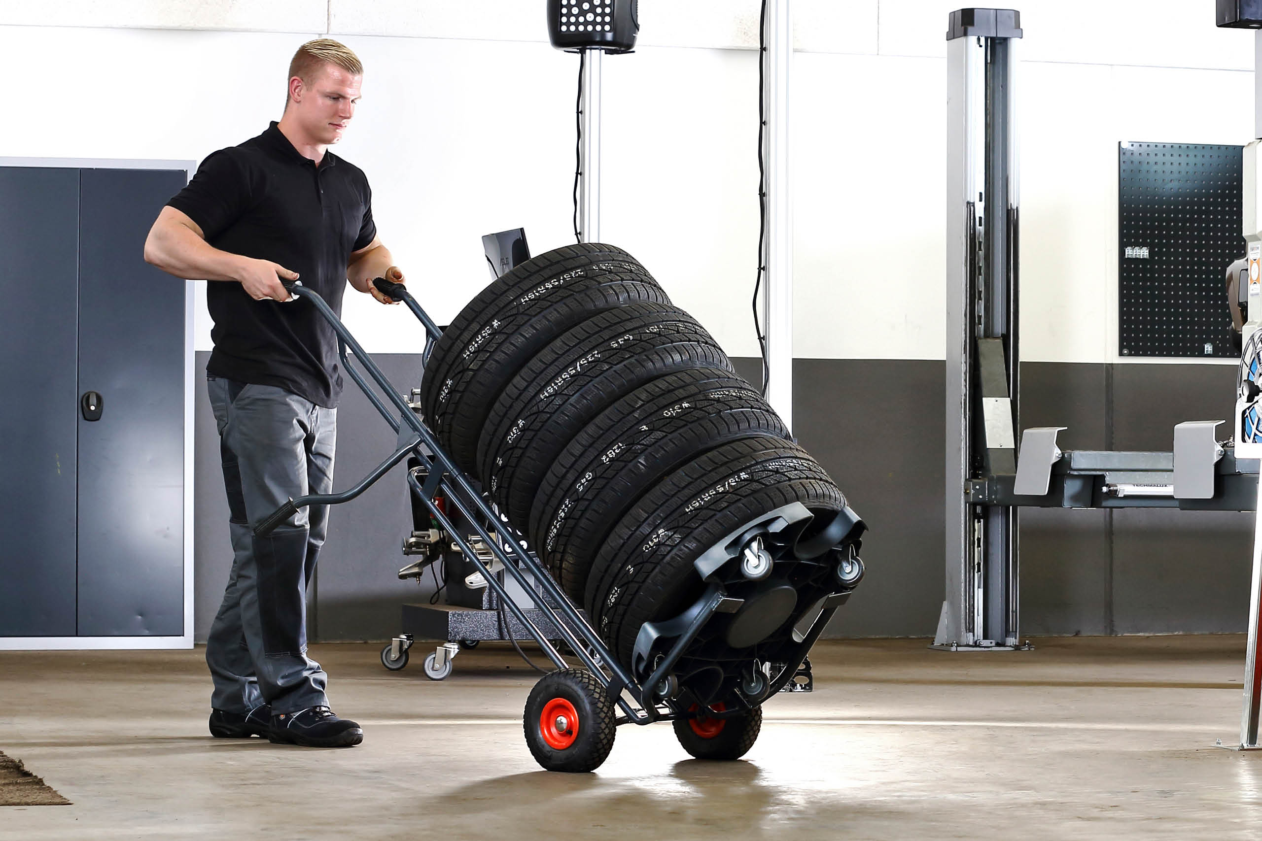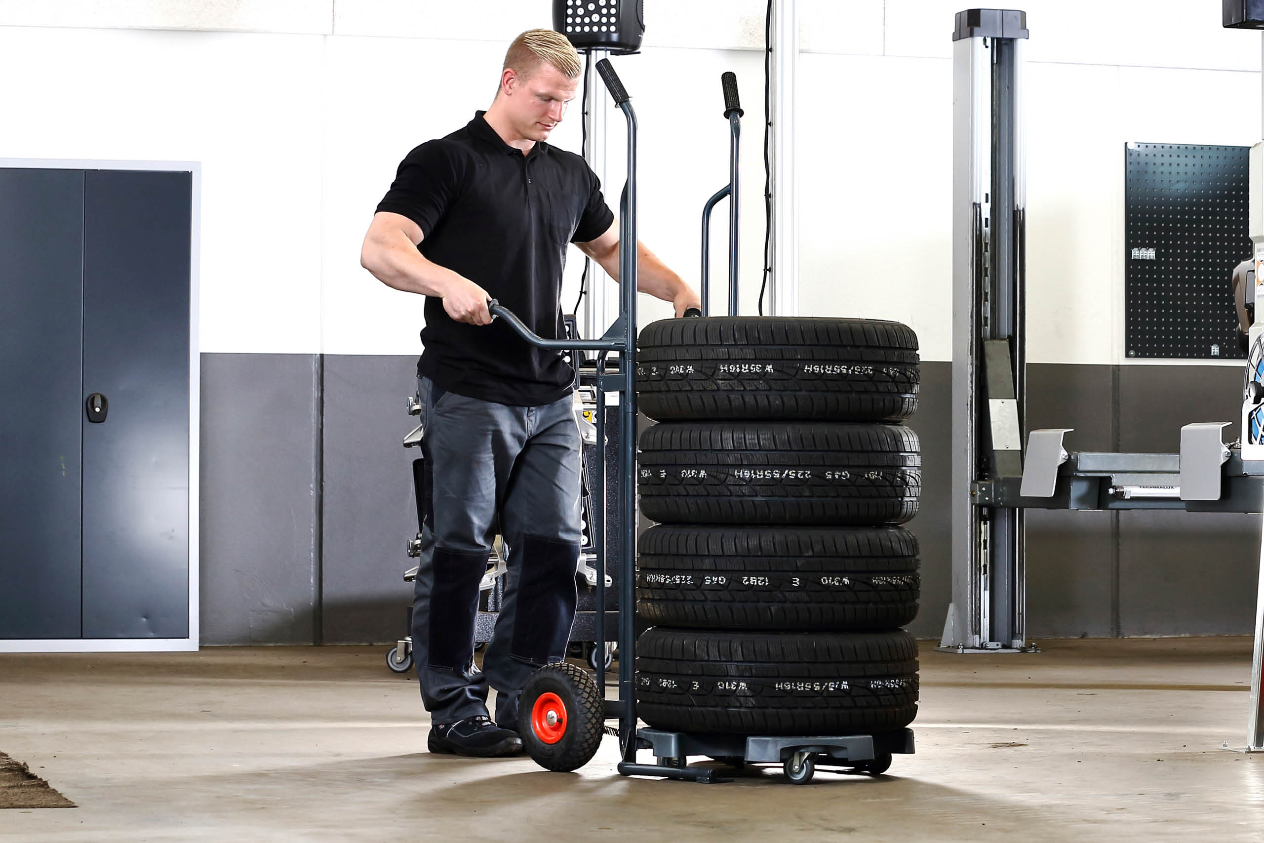 Wheel Caddy er en top funktionel dæk- og hjulvogn, som fungerer som en sækkevogn. Brugen af Wheel Caddy'en letter processen med at flytte en stabel dæk rundt på værkstedet - eller hjul til og fra bilerne. Transporten med Wheel Caddy'en kan takket være de store gummihjul sagtens foregå over lidt længere afstande - såsom henover en gårdsplads. Wheel Caddy'en har en lav egenvægt, men kan transportere helt op til 200 kg. De lange håndtag fungerer som løftestænger og betyder, at vægten reduceres, og det er nemt at flytte rundt med de tunge hjul. Wheel Caddy kan anvendes både med og uden en Wheel Trolley under hjulene/dækkene. De bevægelige gafler kan gribe ind under hhv. Wheel Trolley eller hjul/dæk, og man sparer med andre ord besværet med at skulle lægge hjulene/dækkene op på gaflen. Wheel Caddyen kan i øvrigt lægges ned, så den hviler på håndtagene. Hjulene kan herved løftes manuelt fra en gunstig løfte højde/position