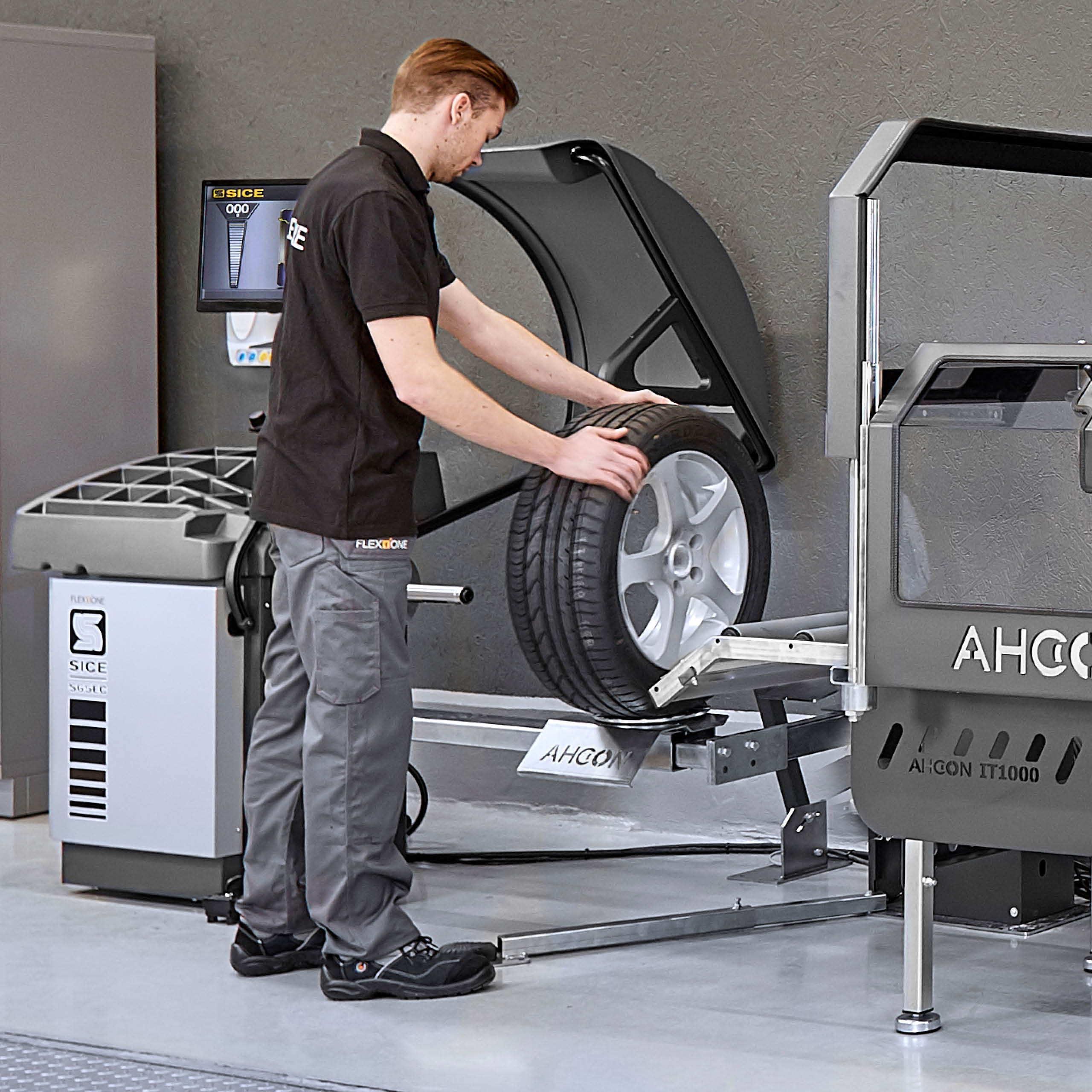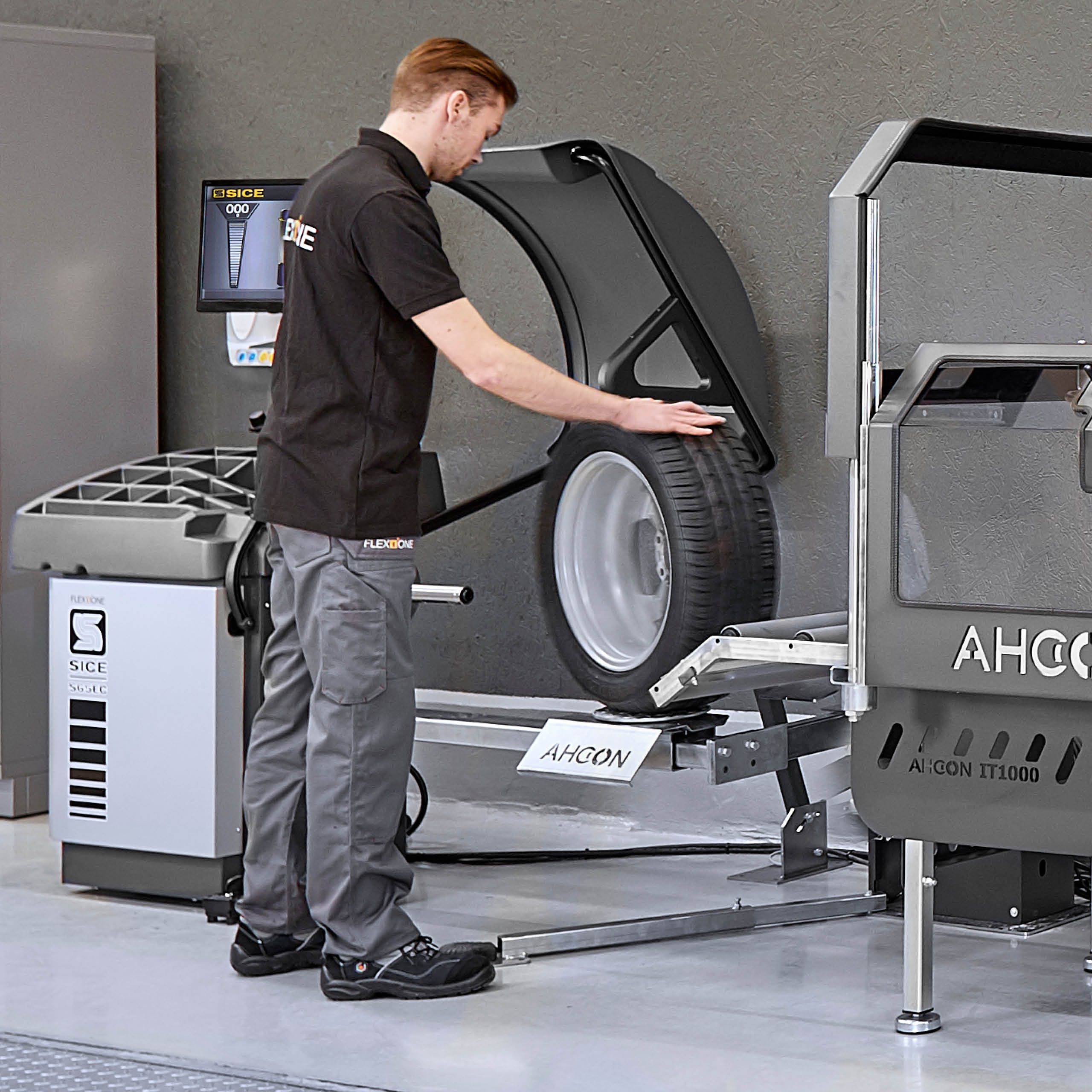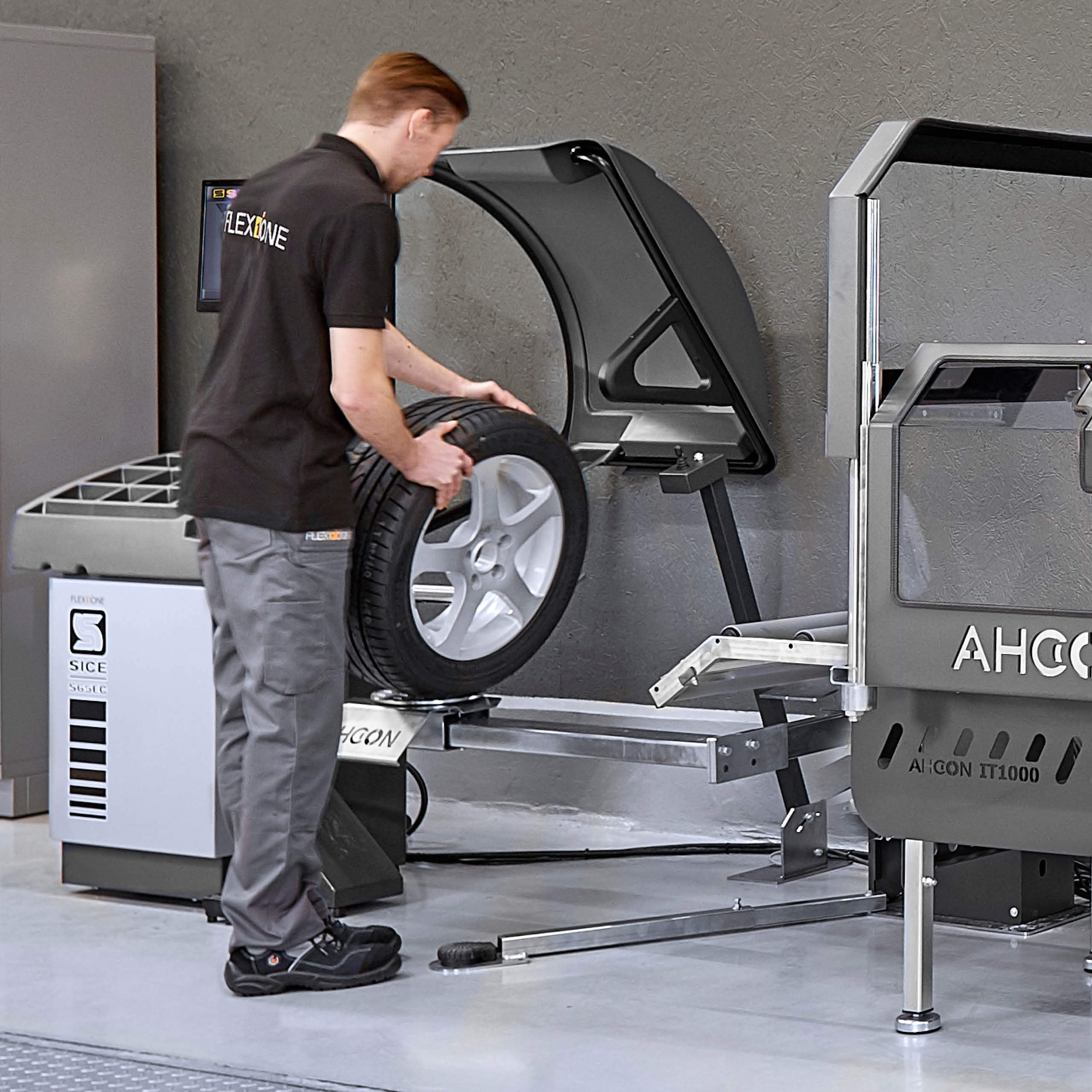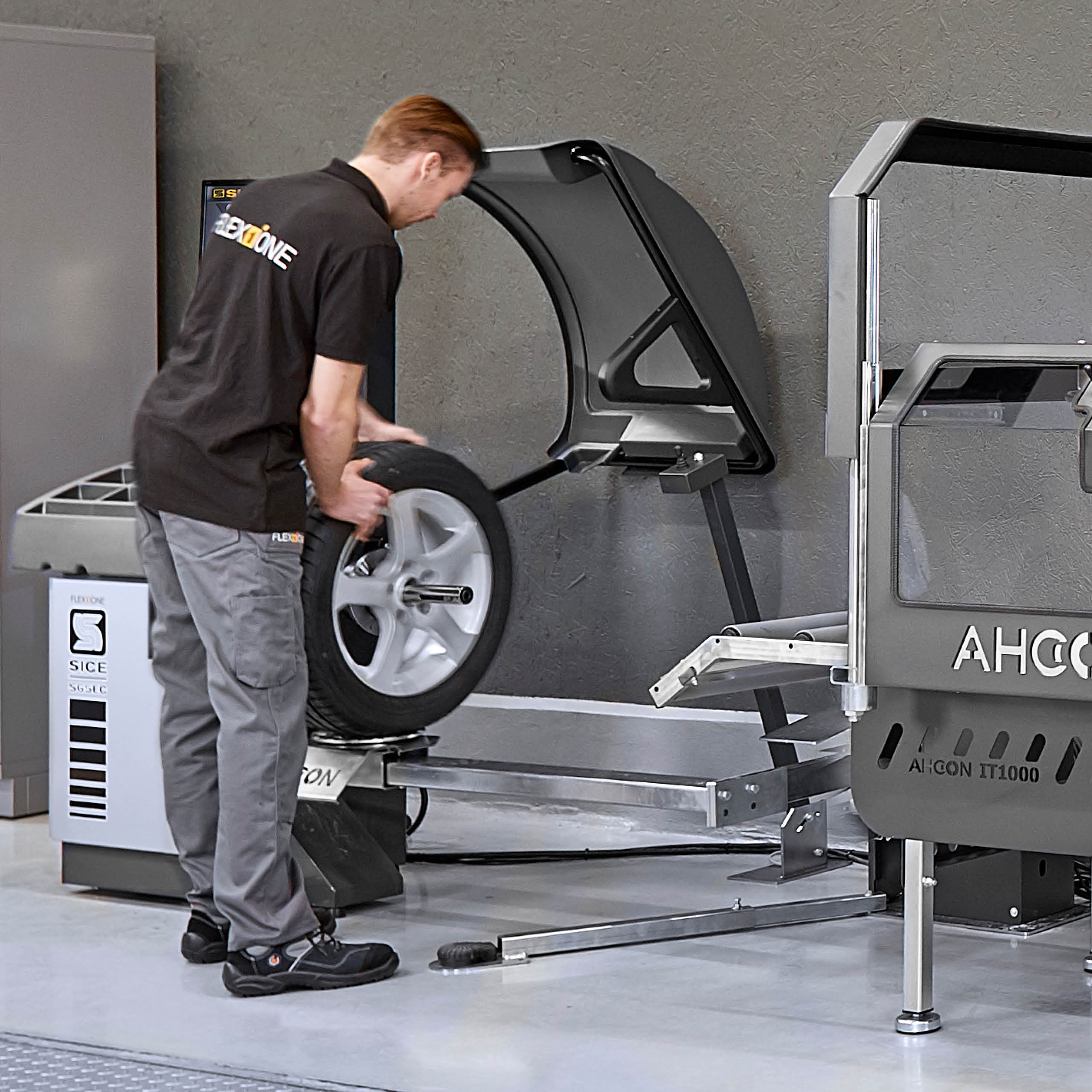 Ved hjælp af fodpedalen bringes hjulet nu op til den korrekte højde for opspænding på afbalanceringsmaskinen. På den måde undgår mekanikeren dumme løft og vrid i ryggen.