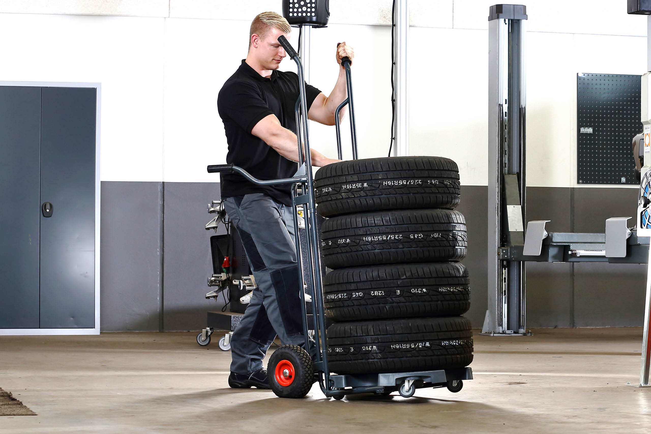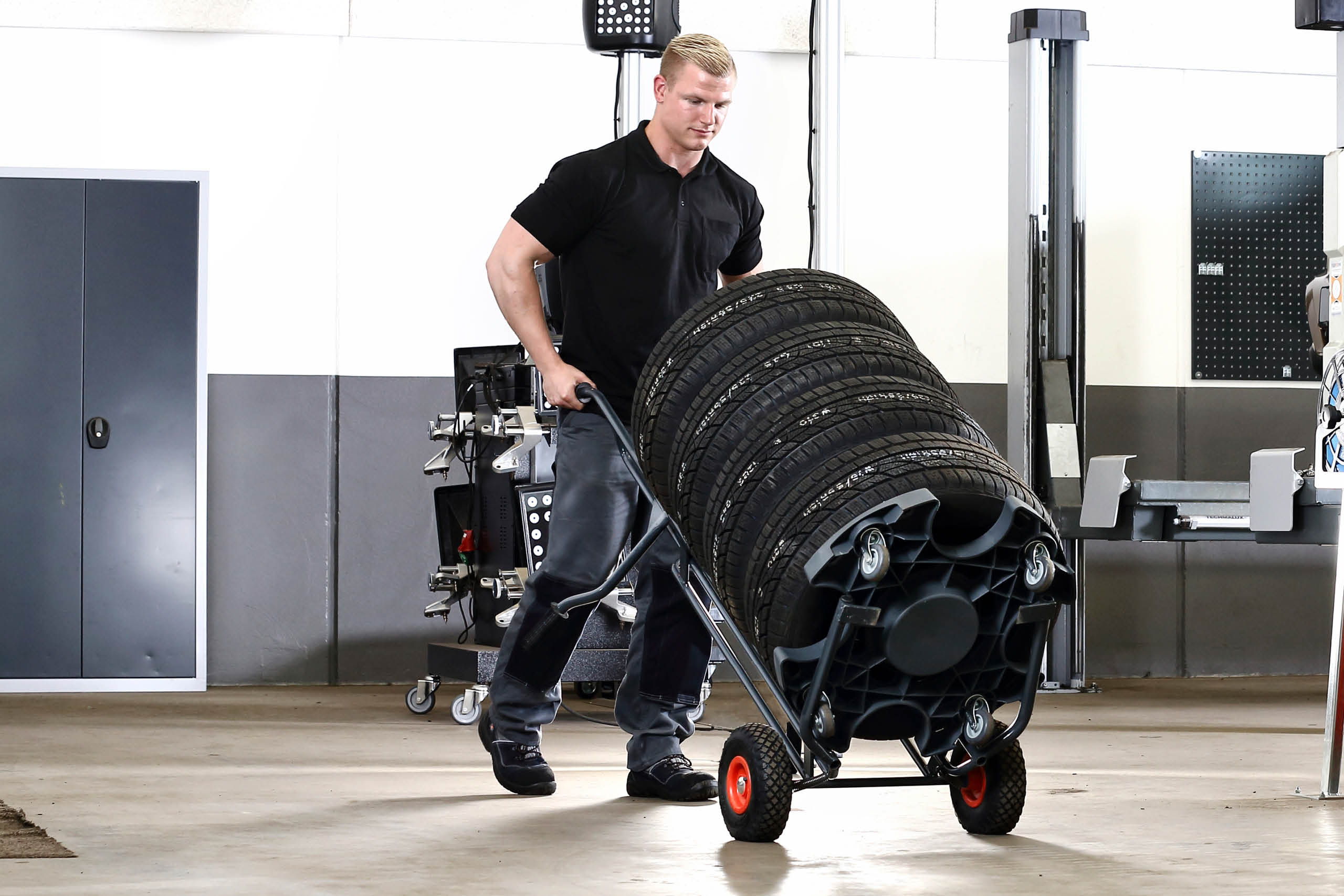 Wheel Caddy er en top funktionel dæk- og hjulvogn, som fungerer som en sækkevogn. Brugen af Wheel Caddy'en letter processen med at flytte en stabel dæk rundt på værkstedet - eller hjul til og fra bilerne. Transporten med Wheel Caddy'en kan takket være de store gummihjul sagtens foregå over lidt længere afstande - såsom henover en gårdsplads. Wheel Caddy'en har en lav egenvægt, men kan transportere helt op til 200 kg. De lange håndtag fungerer som løftestænger og betyder, at vægten reduceres, og det er nemt at flytte rundt med de tunge hjul. Wheel Caddy kan anvendes både med og uden en Wheel Trolley under hjulene/dækkene. De bevægelige gafler kan gribe ind under hhv. Wheel Trolley eller hjul/dæk, og man sparer med andre ord besværet med at skulle lægge hjulene/dækkene op på gaflen. Wheel Caddyen kan i øvrigt lægges ned, så den hviler på håndtagene. Hjulene kan herved løftes manuelt fra en gunstig løfte højde/position