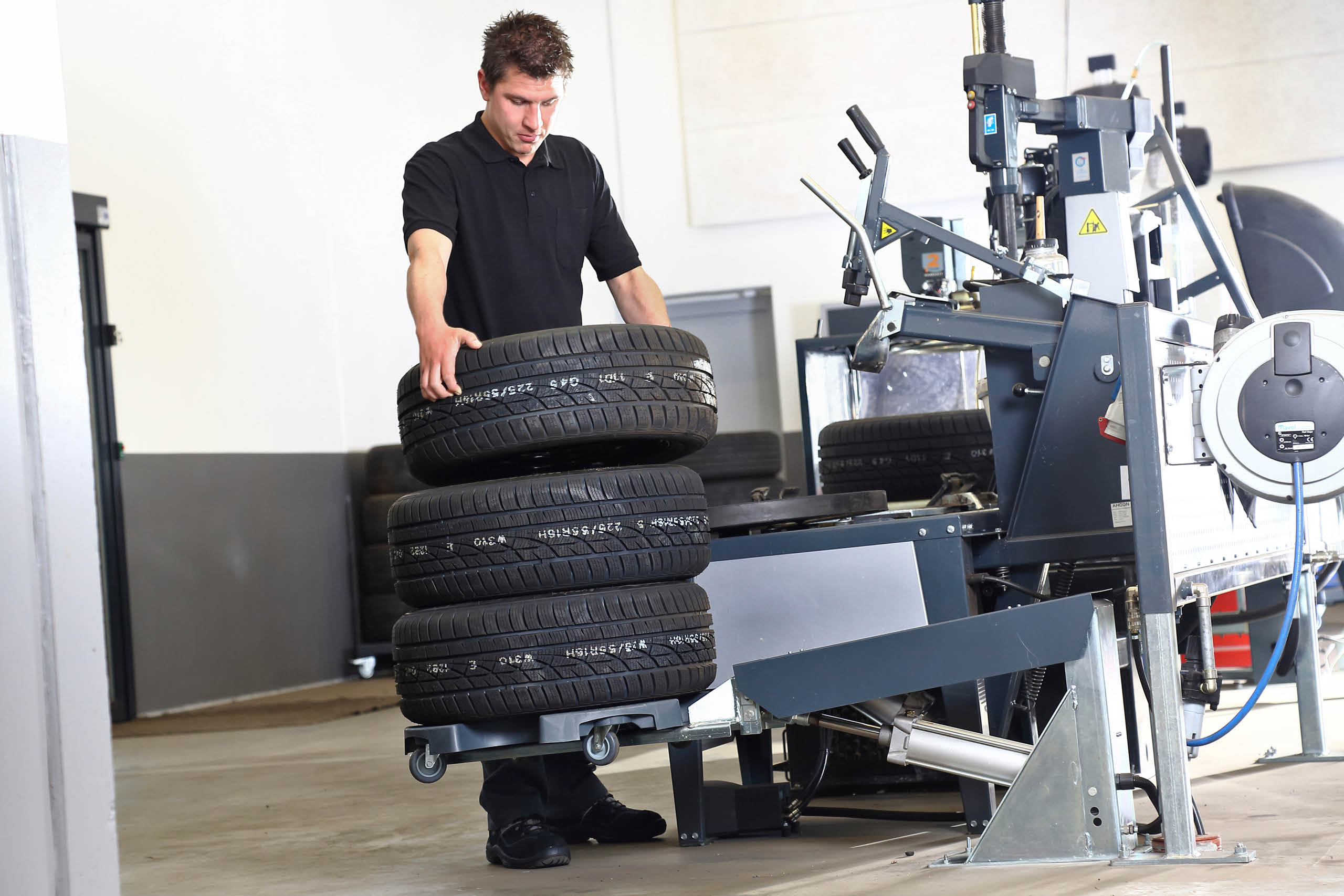 De afmonterede hjul kan på Wheel Trolley'en nemt og ubesværet trilles hen til en dækservicemaskine.